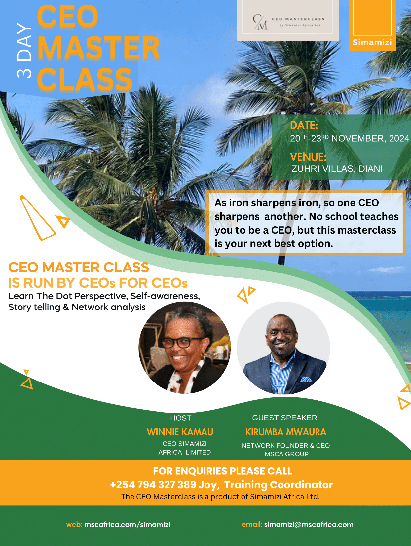 There is now a critical mass of CEOs in Kenya who have since exited into other pursuits. Their stories are well known, told to great acclaim or criticism. The CEO Masterclass provides you with the model to use in structuring your CEO trajectory so that your story is told as you want it to be.